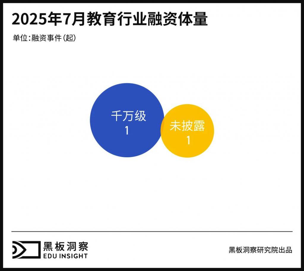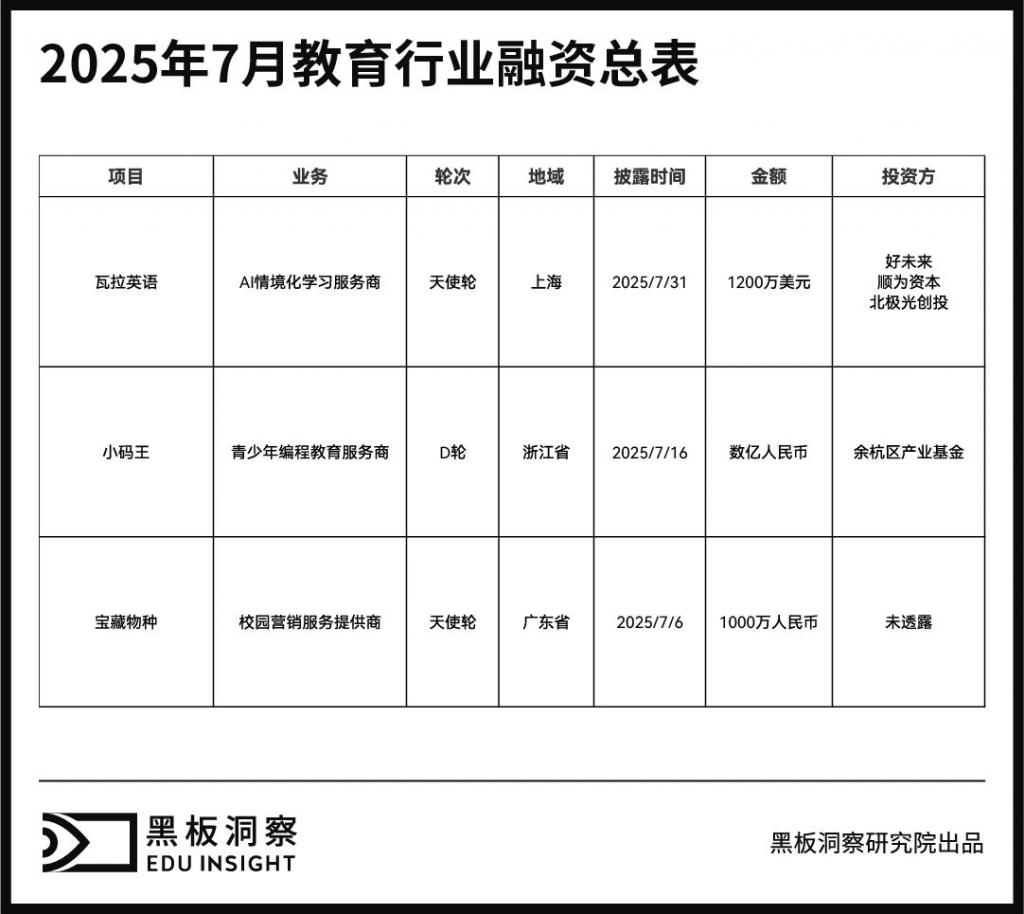 2025 年 7 月教育行业共发生 3 起融资事件,融资总金额约为 8200 万人民币,分别为:近日,专注全流程 AI 情境化学习的瓦拉英语获得天使轮融资。据瓦拉英语创始人刘庆逊透露,北极光投资顾问(北京)有限公司、北京顺为创业投资有限公司以及好未来集团联合注资 1200 万美元。7 月 16 日,少儿编程教育公司小码王完成 D 轮数亿元融资,投资方包括余杭区产业基金等政府性基金及资本市场机构。宝藏物种(上海)信息科技有限公司正式对外宣布,已成功完成 1000 万元人民币的天使轮融资。此次融资将成为企业发展的重要里程碑,为其在校园营销领域的战略布局注入强劲动力,进一步深化在年轻消费市场的开拓与耕耘。