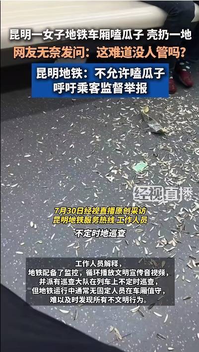 7月30日,经视直播记者就此事联系昆明地铁服务热线。工作人员表示,地铁车厢内是严禁饮食的,“像这种嗑瓜子的行为更是不允许。”